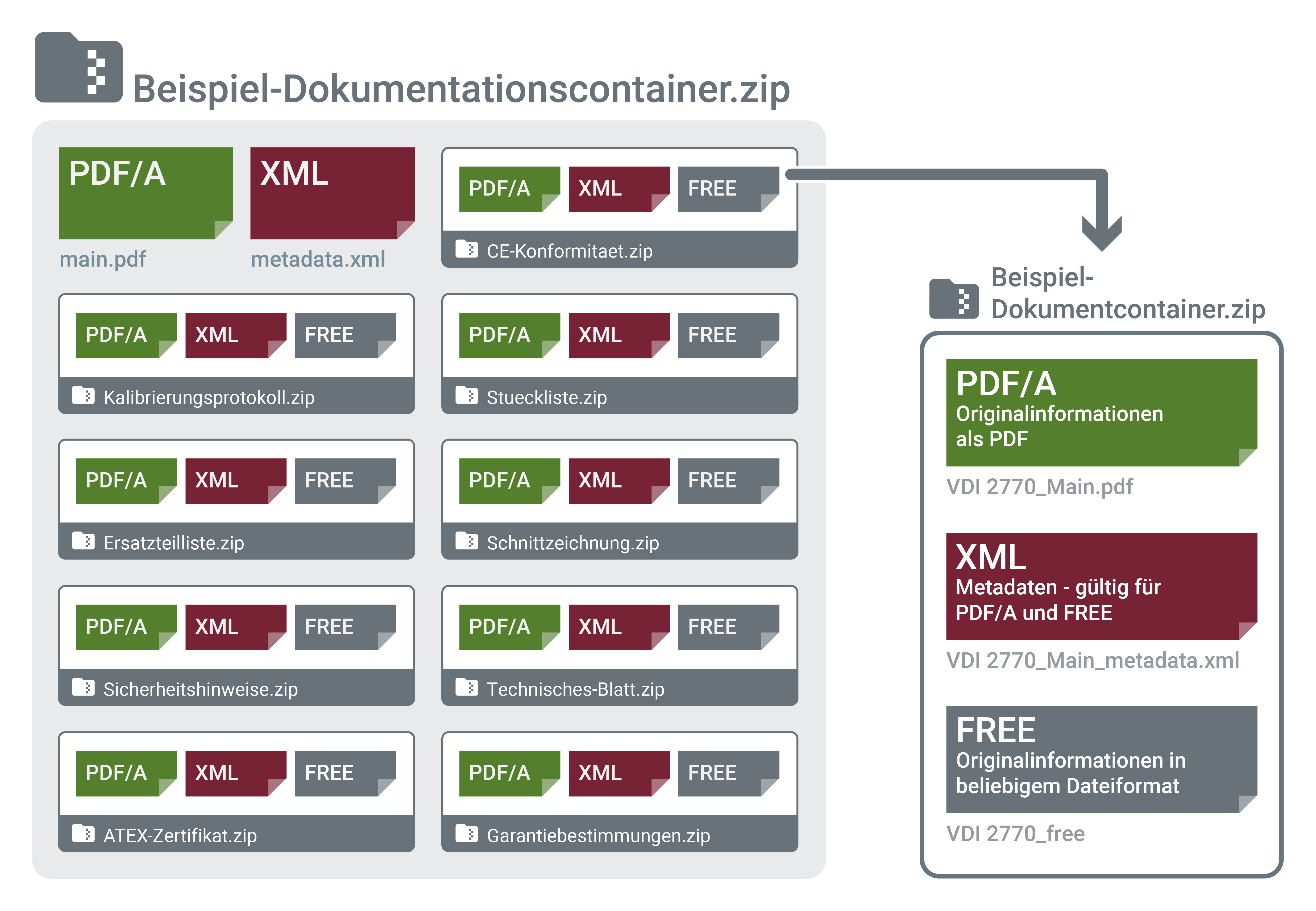 Ein Dokumentationscontainer gemäß VDI 2770 Standard enthält eine PDF- und eine XML-Hauptdatei sowie einen Dokumentcontainer für jede PDF-Datei.