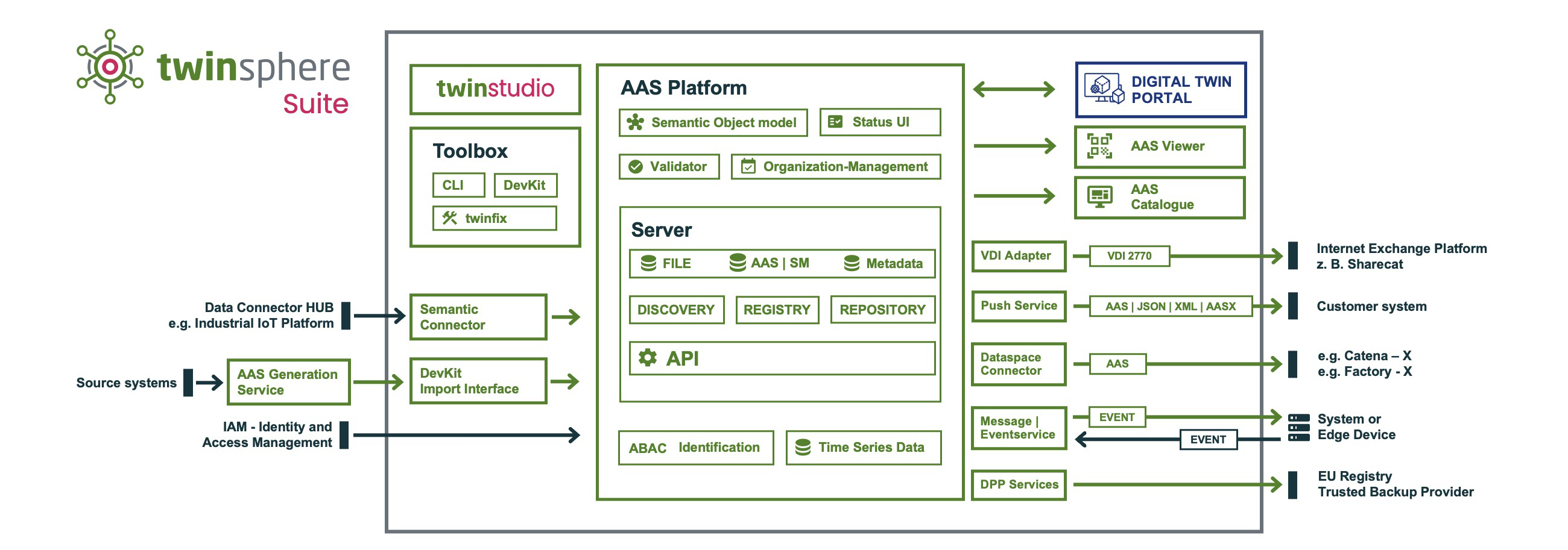 twinsphere ist eine SaaS Lösung zur standardisierten Übertragung von Produktinformationen über den gesamten Lifecycle. Sie basiert auf dem Standard der Asset Administration Shell der IDTA. Über ein twinsphere SDK können vereinfacht Asset Administration Shells generiert und auf die Plattform hochgeladen und dort verwaltet werden.